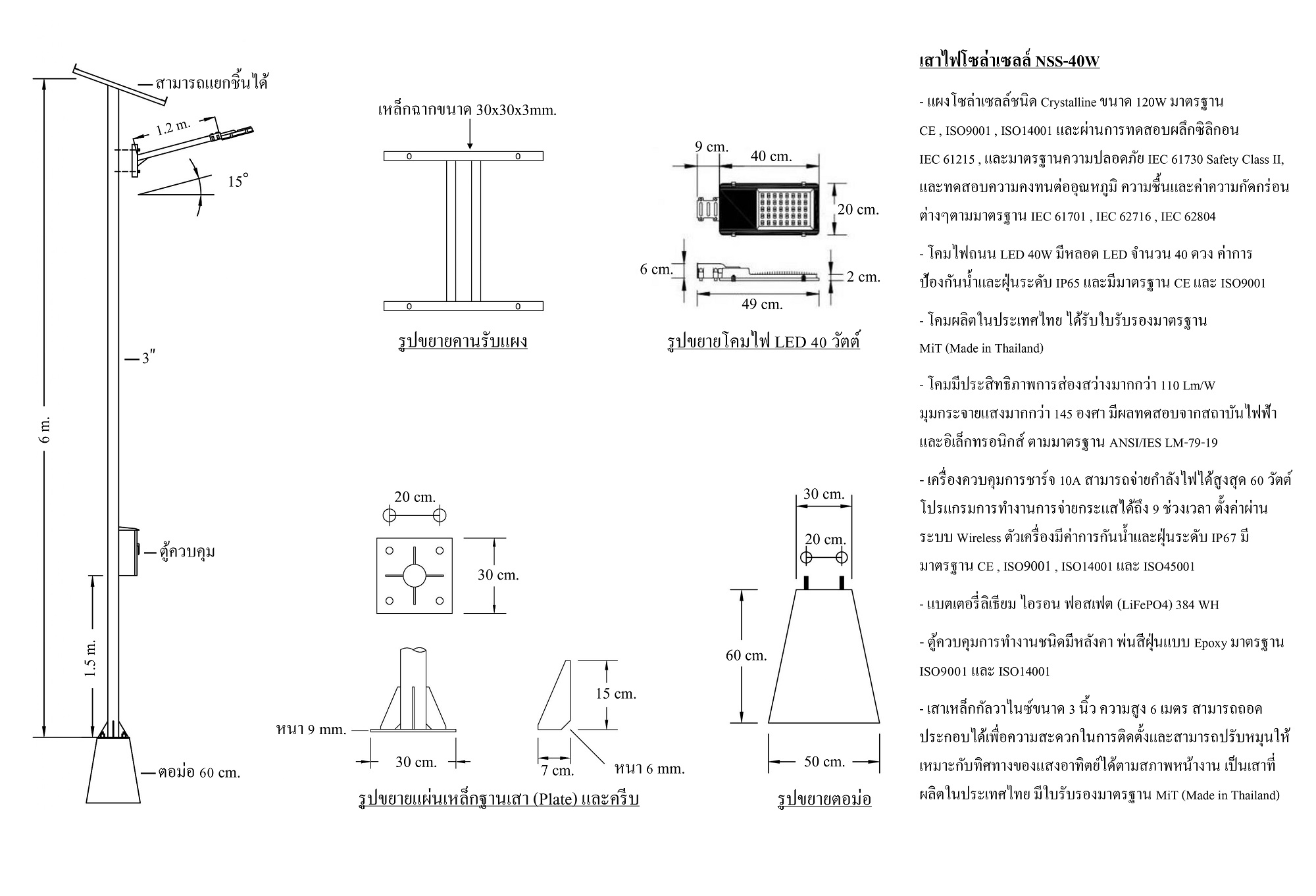 เสาไฟโซล่าเซลล์แบบ Super all in one แนวทางเดียวกับรุ่นพี่ NSB-100W ไม่โกงวัตต์ แต่ลดสเปคลงมาเพื่อแข่งขันในตลาด เหมาะสำหรับเสาไฟถนนสูง 4-6 เมตร