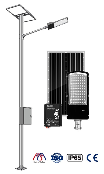 ไฟถนนโซล่าเซลล์ 150W เสาไฟโซล่าเซลล์ประกอบจากวัสดุคุณภาพเกรด A ทุกชิ้น ตัวเสาทำจากเหล็กชุบกัลวาไนซ์กันสนิม 100% แผงโซล่าเซลล์ผ่านการทดสอบมาตรฐาน IEC61730 Safety Class II ควบคุมการทำงานด้วย Solar Charger ที่มีค่าการป้องกันระดับ IP68 มาพร้อมระบบเก็บพลังงานด้วยแบตเตอรี่ลิเธียมแท้ (LiFePO4) วัตต์เต็มเท่านั้น มีอายุการใช้งานที่ยาวนาน