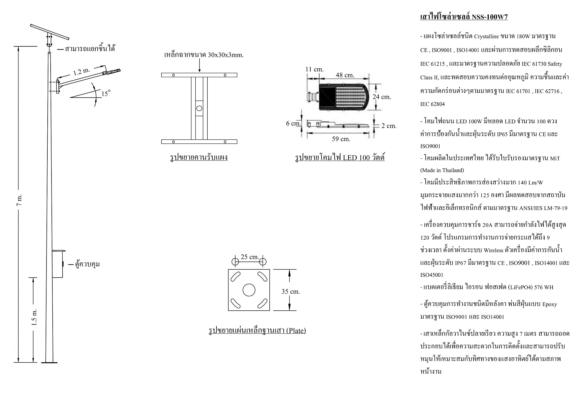 | เสาไฟถนนโซล่าเซลล์ 100W เสา 7 เมตร | 📄 โหลดสเปค NSS-100W7 | 📐 โหลด Drawing |