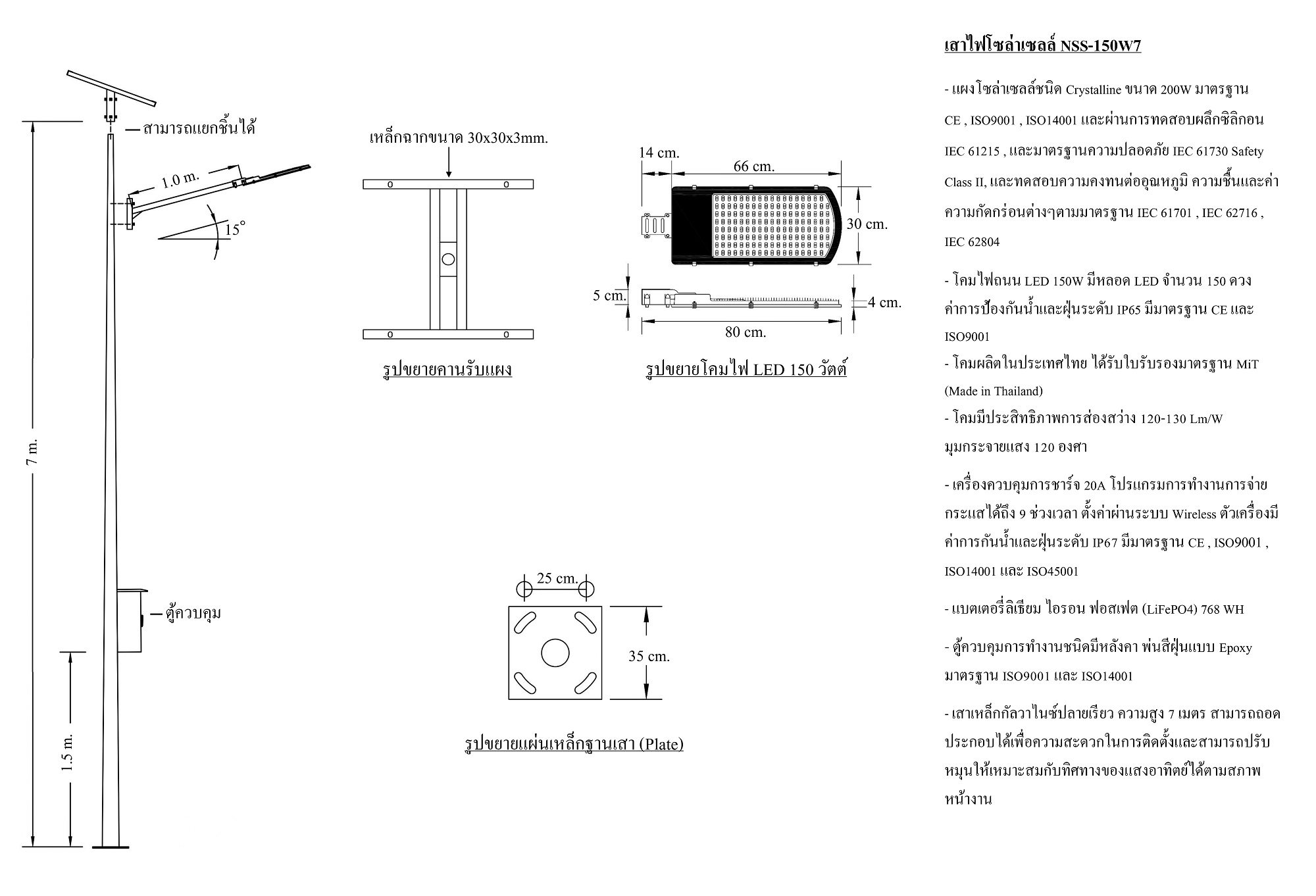| เสาไฟถนนโซล่าเซลล์ 150W เสา 7 เมตร | 📄 โหลดสเปค NSS-150W7 | 📐 โหลด Drawing |