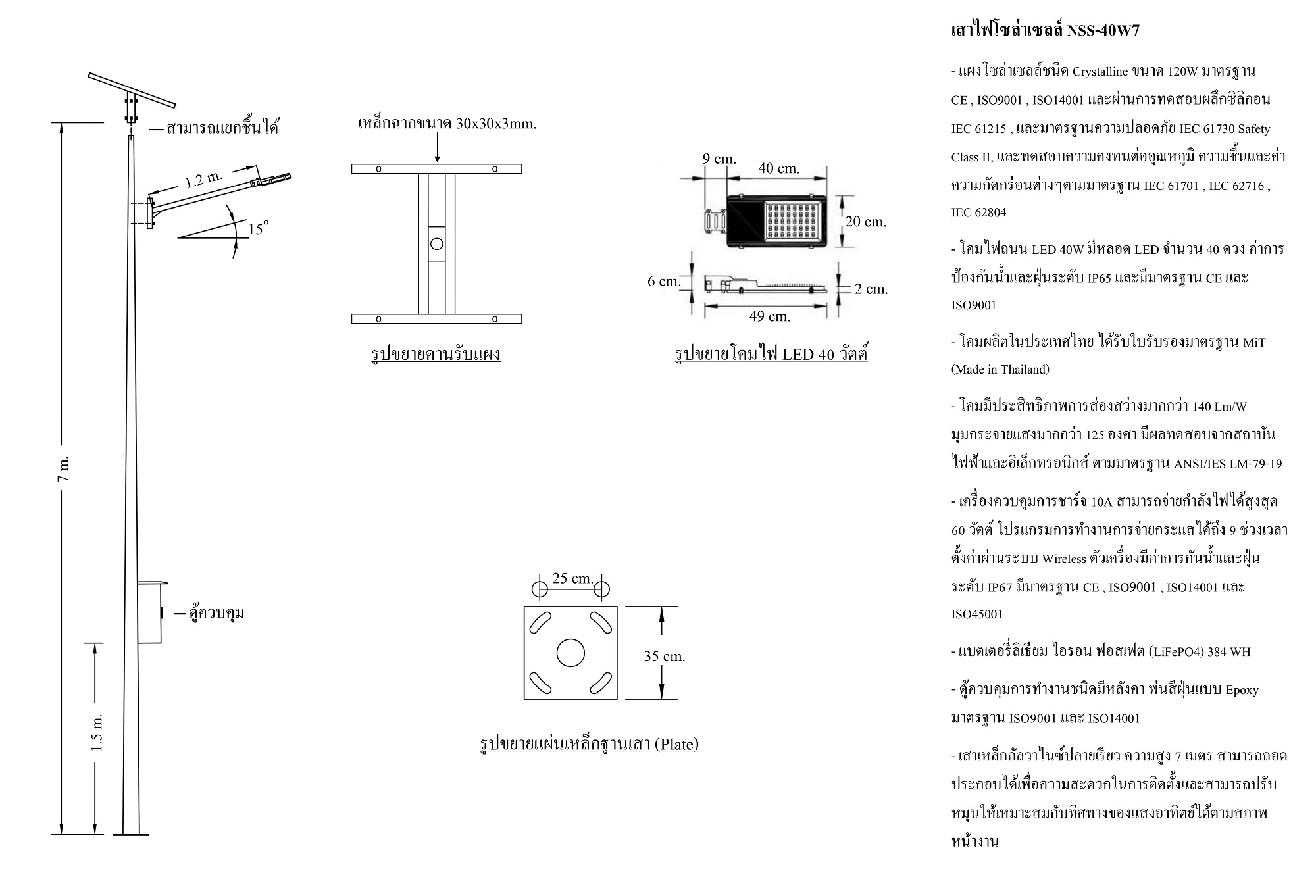 | เสาไฟถนนโซล่าเซลล์ 40W เสา 7 เมตร | 📄 โหลดสเปค NSS-40W7 | 📐 โหลด Drawing |