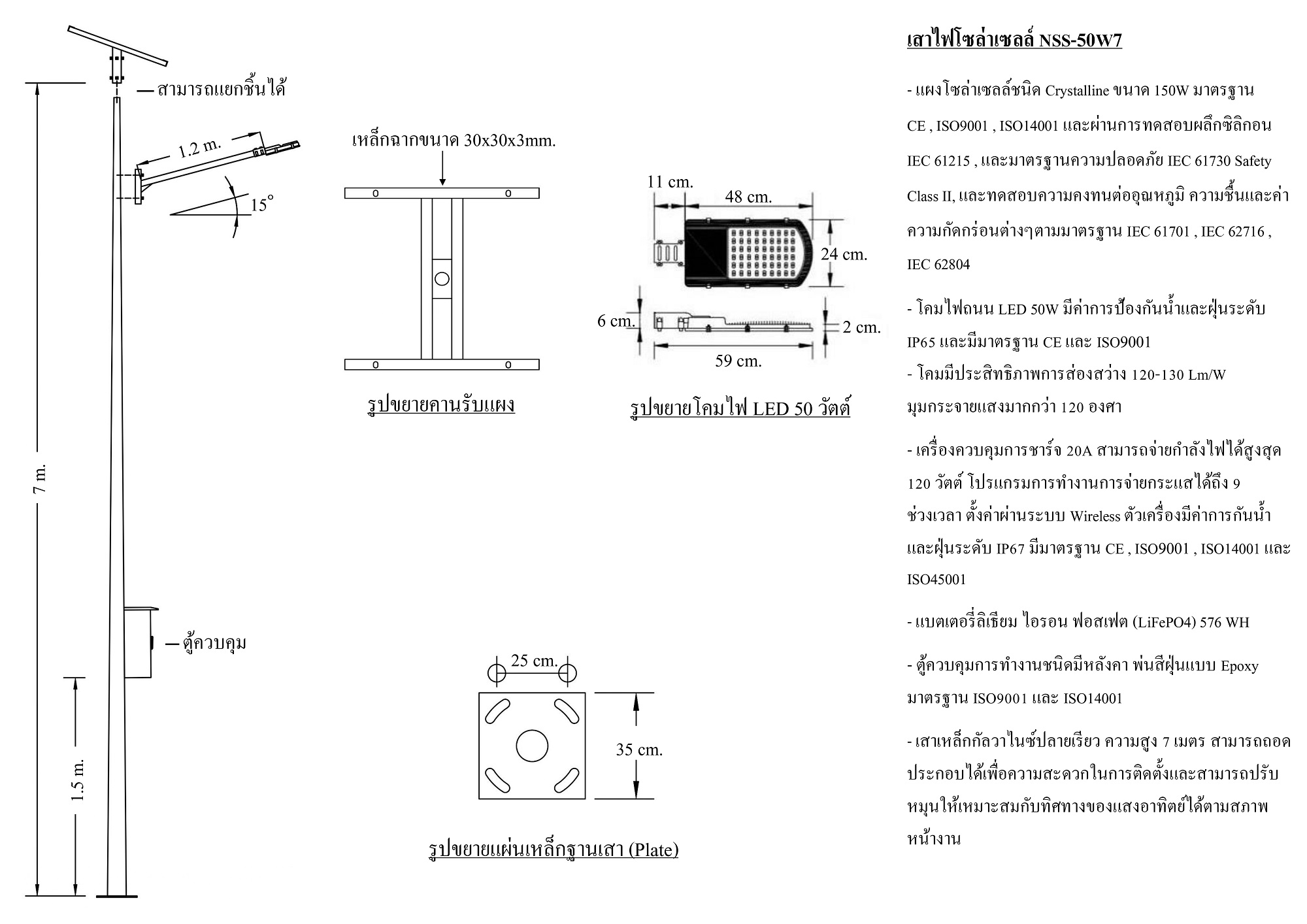 | เสาไฟถนนโซล่าเซลล์ 50W เสา 7 เมตร | 📄 โหลดสเปค NSS-50W7 | 📐 โหลด Drawing |