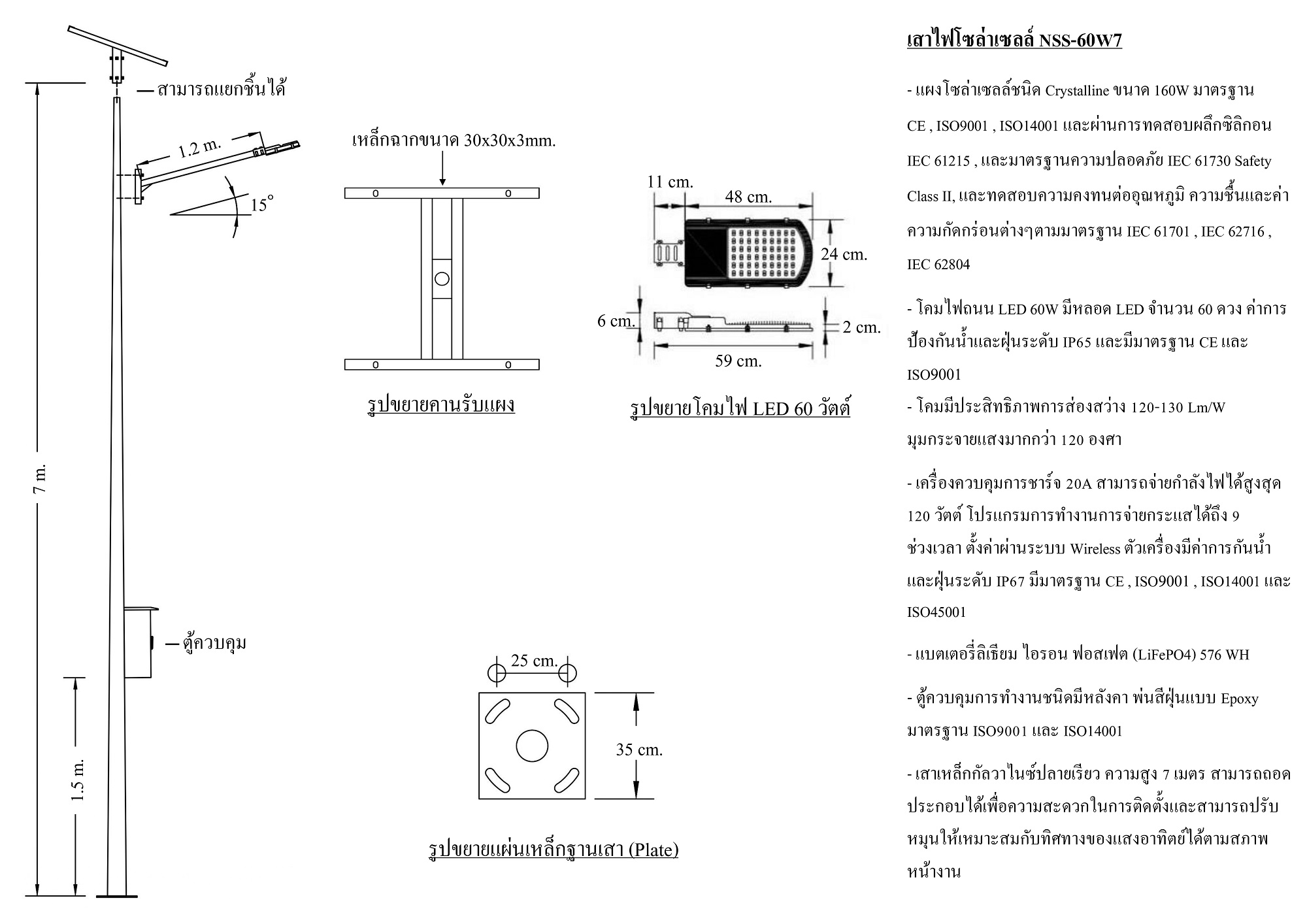 | เสาไฟถนนโซล่าเซลล์ 60W เสา 7 เมตร | 📄 โหลดสเปค NSS-60W7 | 📐 โหลด Drawing |