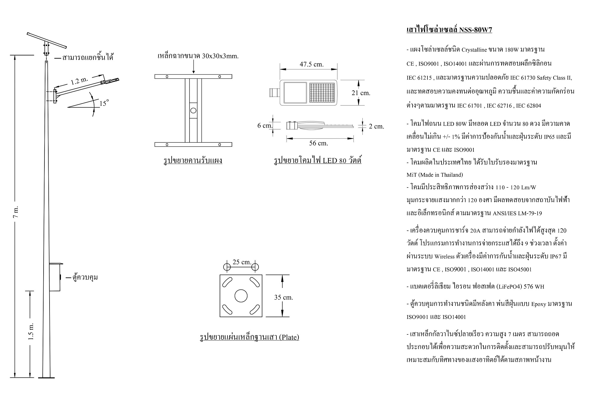 | เสาไฟถนนโซล่าเซลล์ 80W เสา 7 เมตร | 📄 โหลดสเปค NSS-80W7 | 📐 โหลด Drawing |
