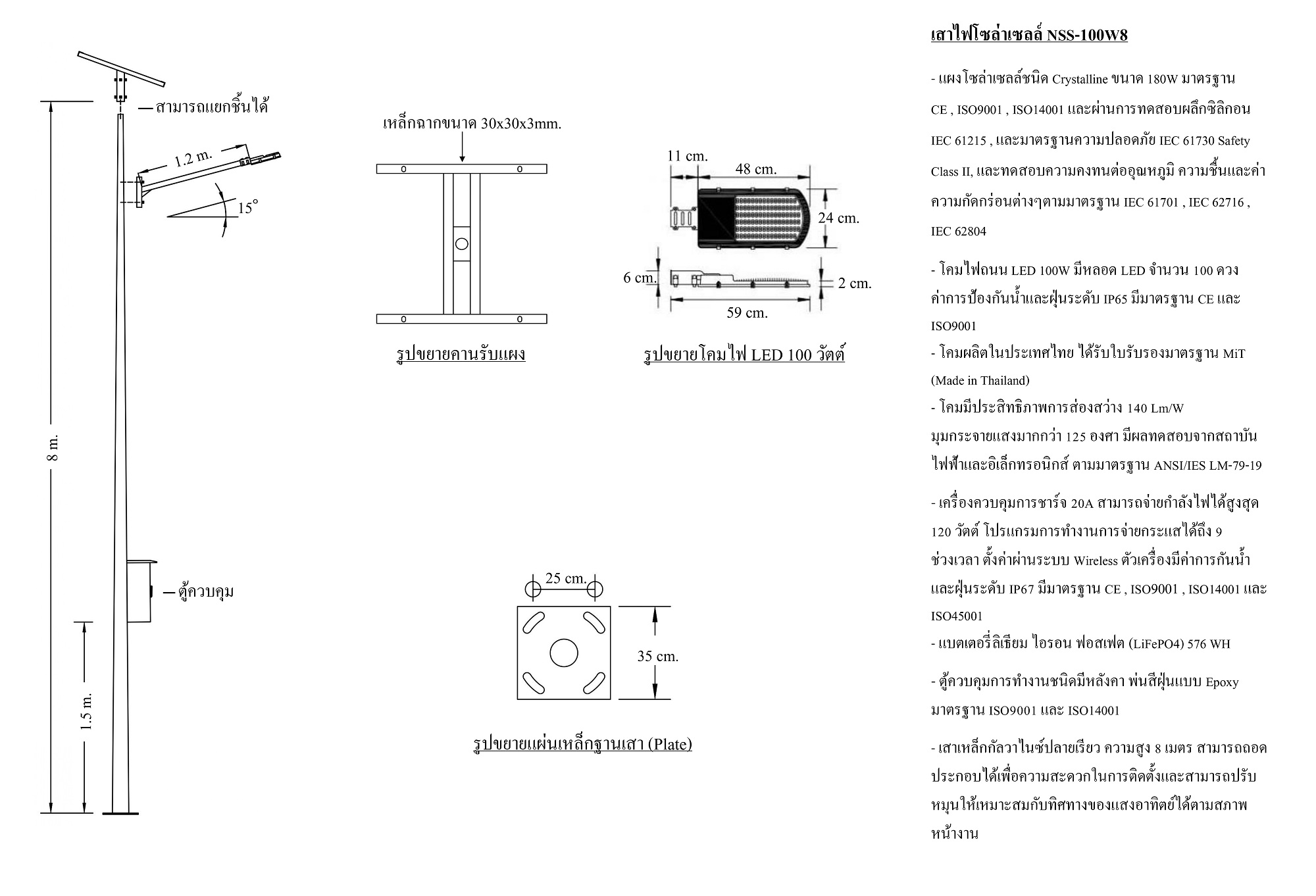 | เสาไฟถนนโซล่าเซลล์ 100W เสา 8 เมตร | 📄 โหลดสเปค NSS-100W8 | 📐 โหลด Drawing |