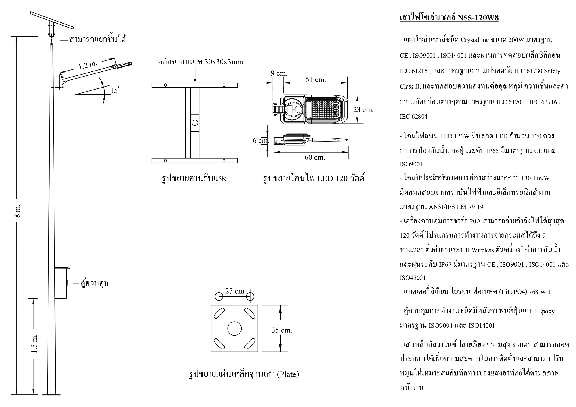 | เสาไฟถนนโซล่าเซลล์ 120W เสา 8 เมตร | 📄 โหลดสเปค NSS-120W8 | 📐 โหลด Drawing |
