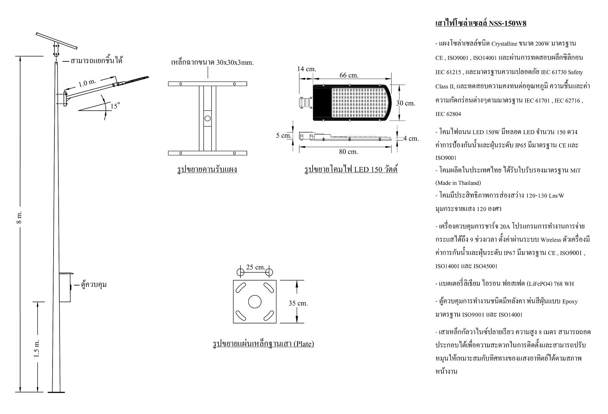 | เสาไฟถนนโซล่าเซลล์ 150W เสา 8 เมตร | 📄 โหลดสเปค NSS-150W8 | 📐 โหลด Drawing |