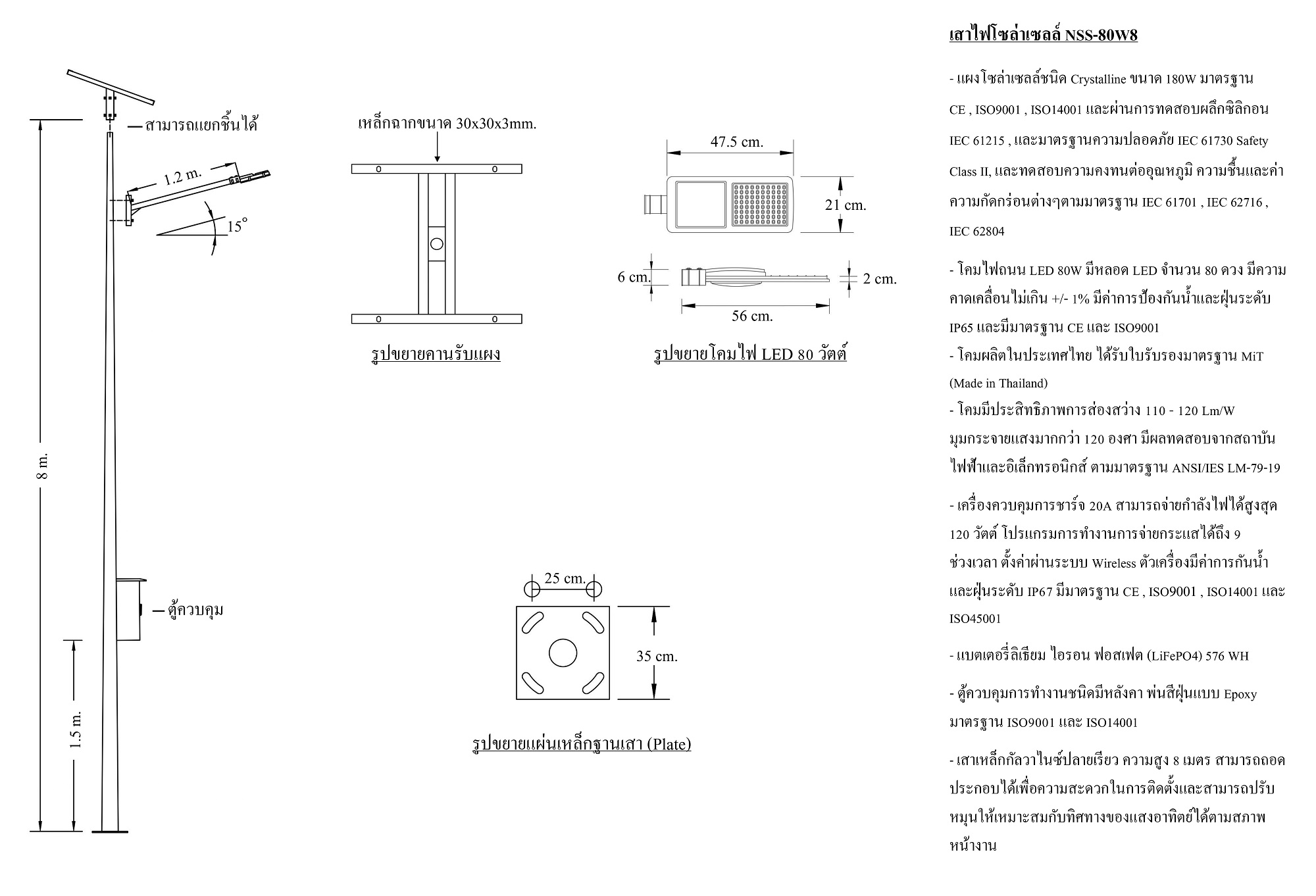 | เสาไฟถนนโซล่าเซลล์ 80W เสา 8 เมตร | 📄 โหลดสเปค NSS-80W8 | 📐 โหลด Drawing |